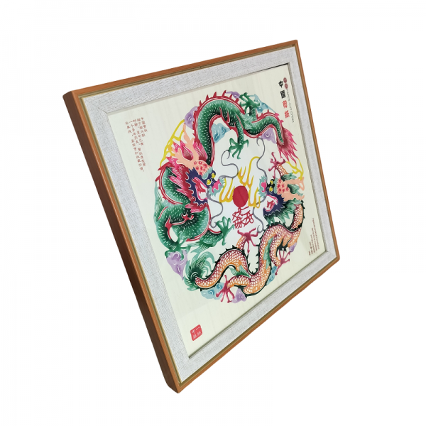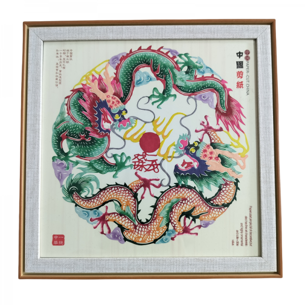 Two dragons play with pearls Colorful paper-cut picture